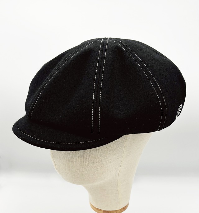 W-Newsboy カラー:ブラック ステッチ糸:ホワイト サイズ/フリー 内寸法:62cm 帽子内側にアジャストベルトあり/最小調整寸法:56cm 素材/ウール100% 日本製