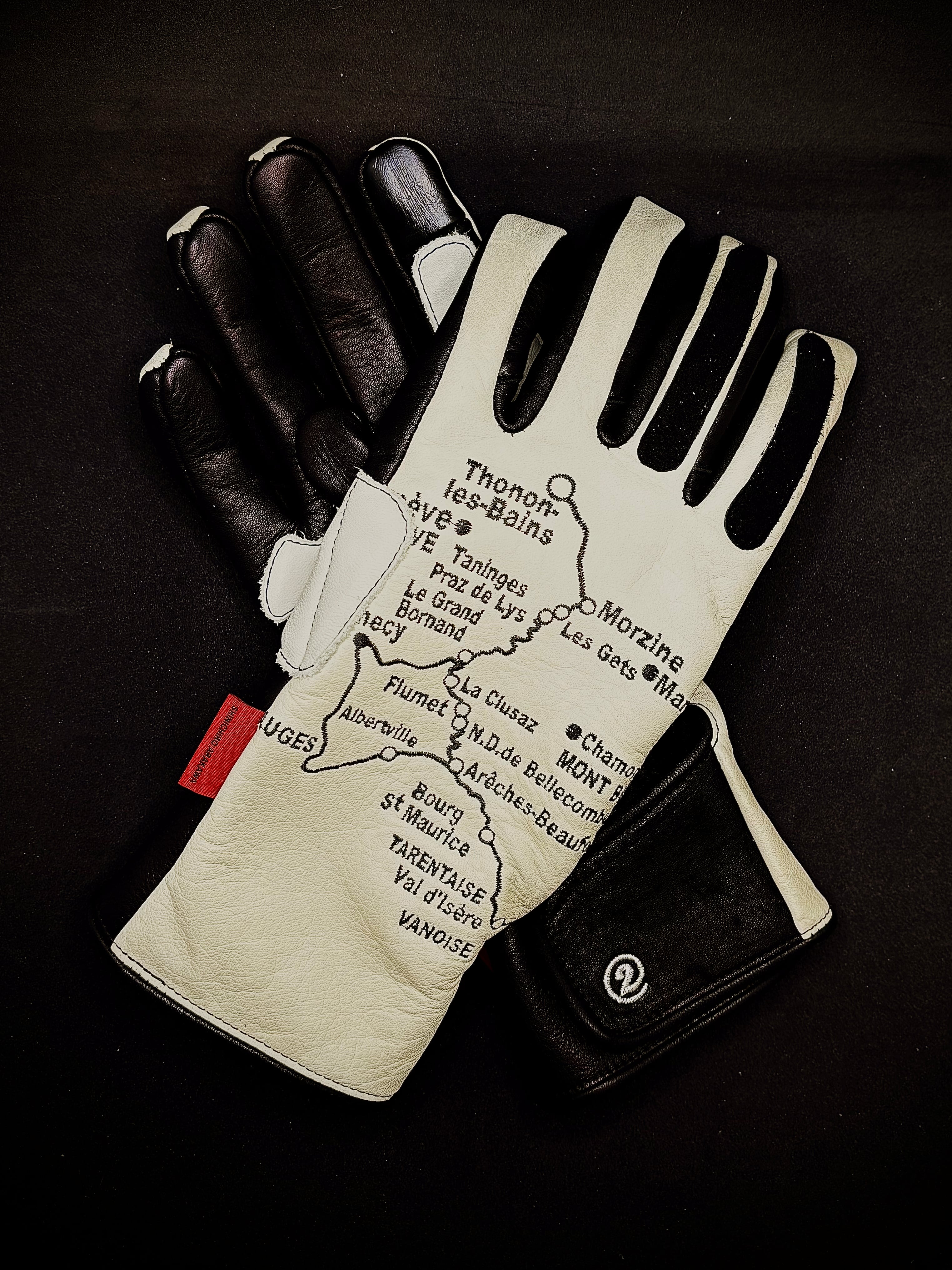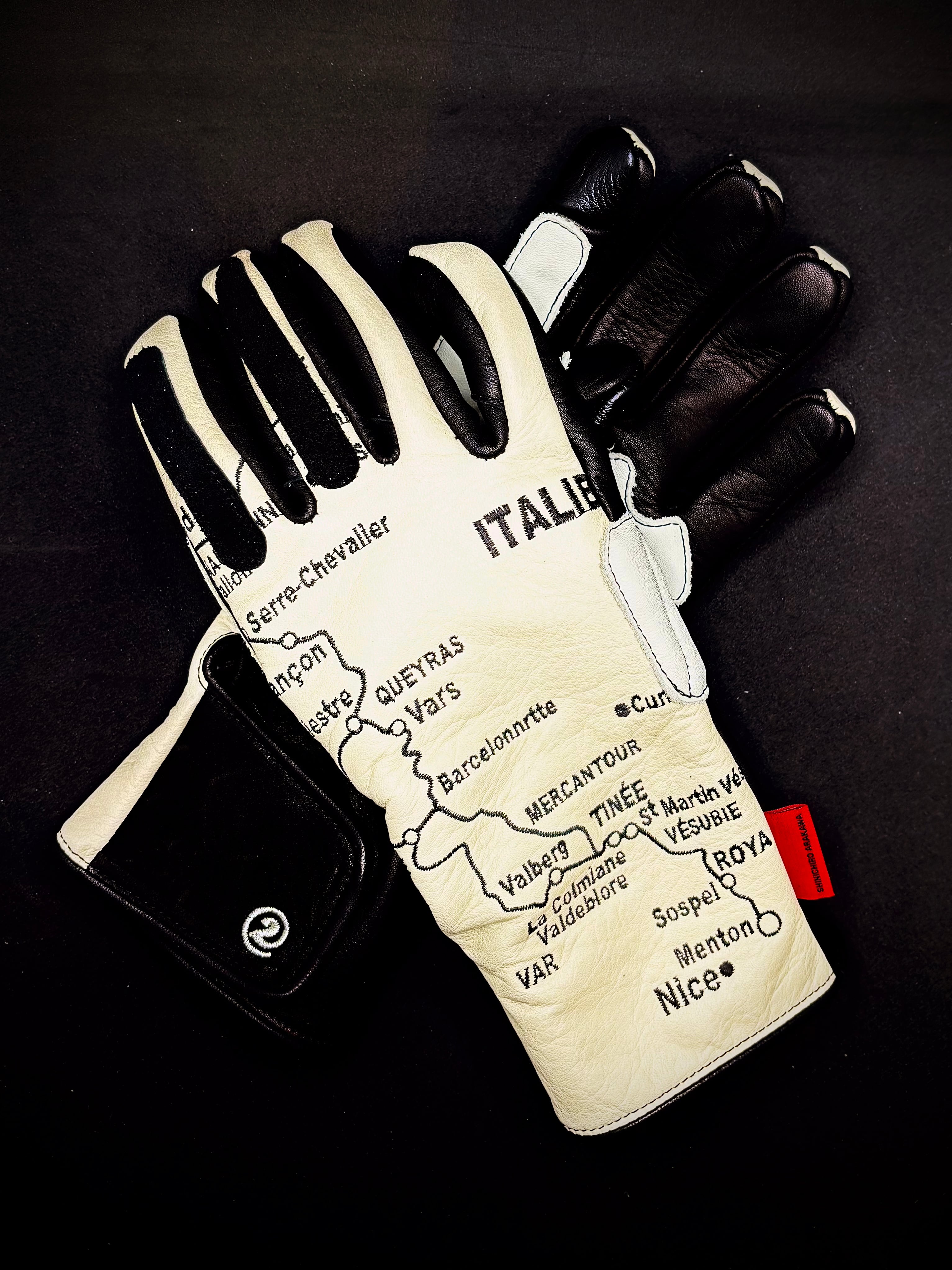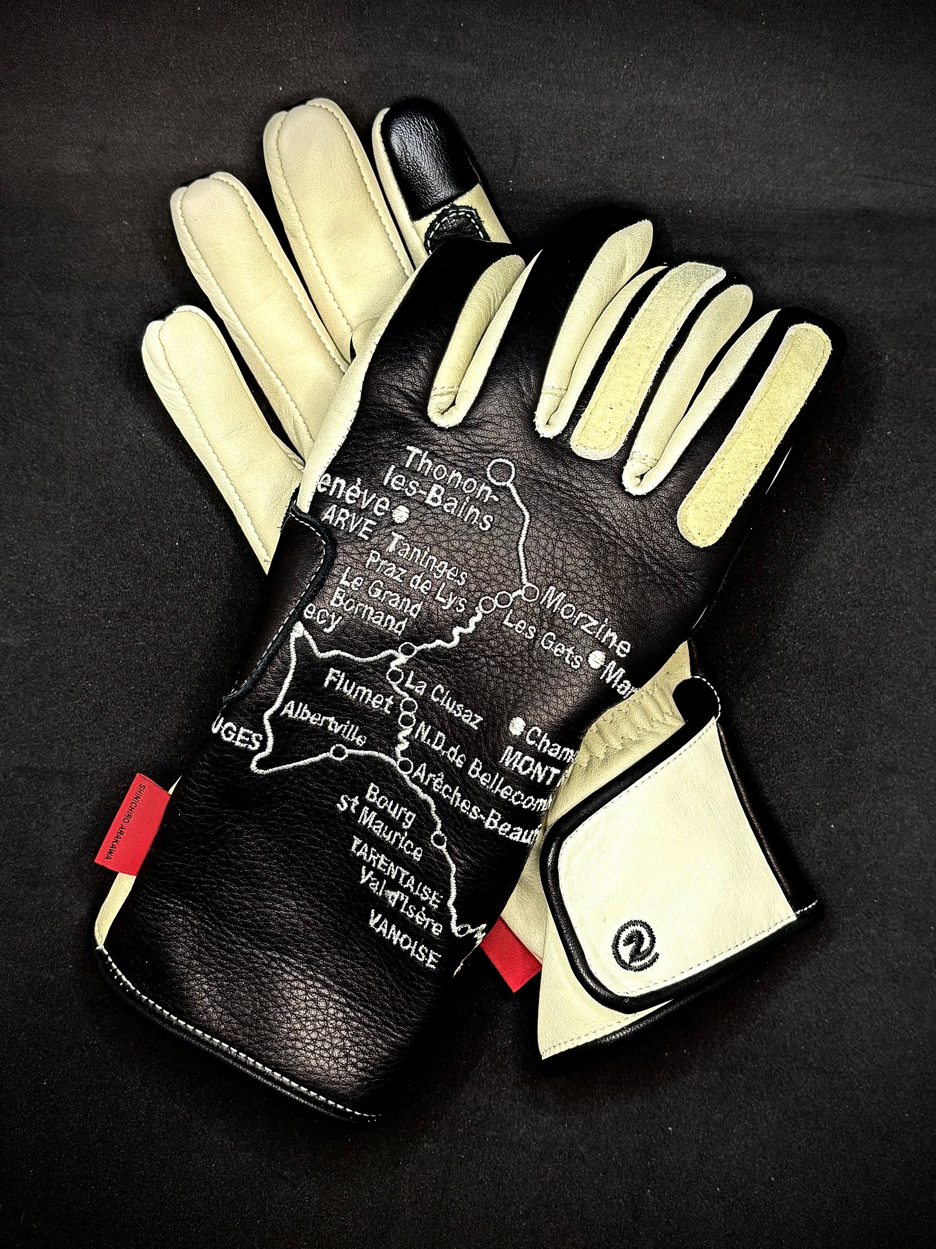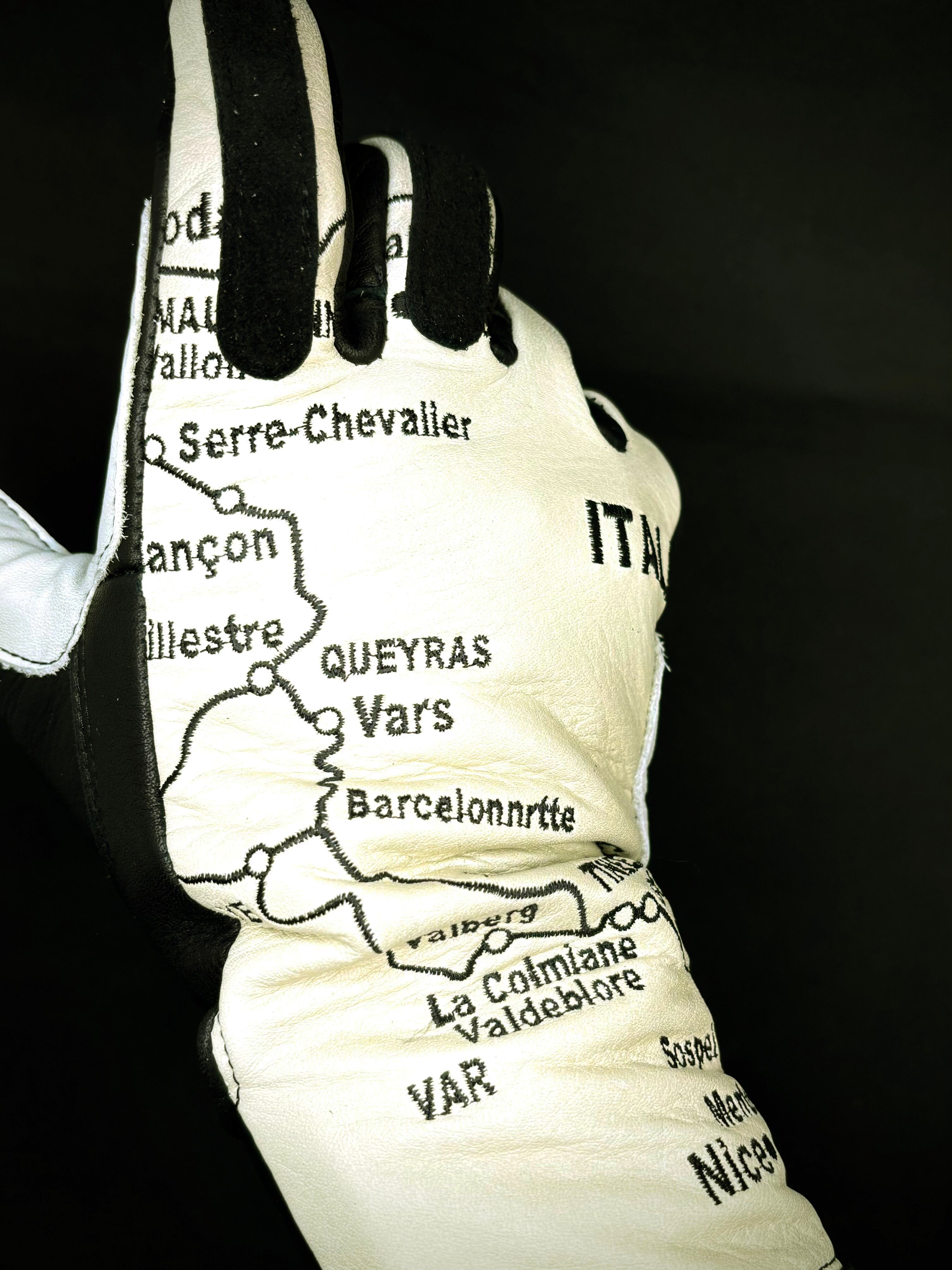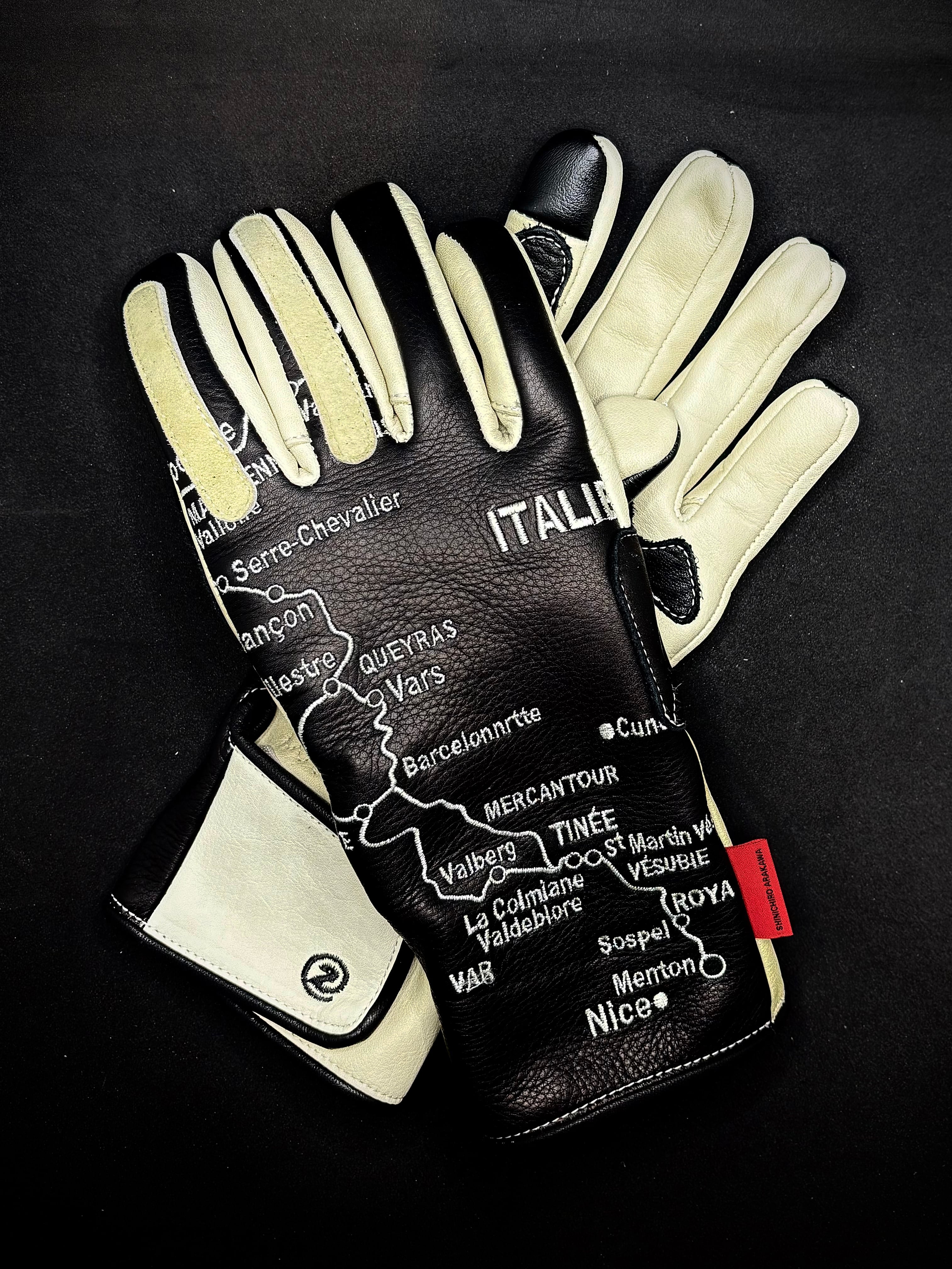 左右の手の甲にヨーロッパの美しいアルプス山脈の街道の地図を刺繍を施したヴィンテージレーシングタイプグローブ。