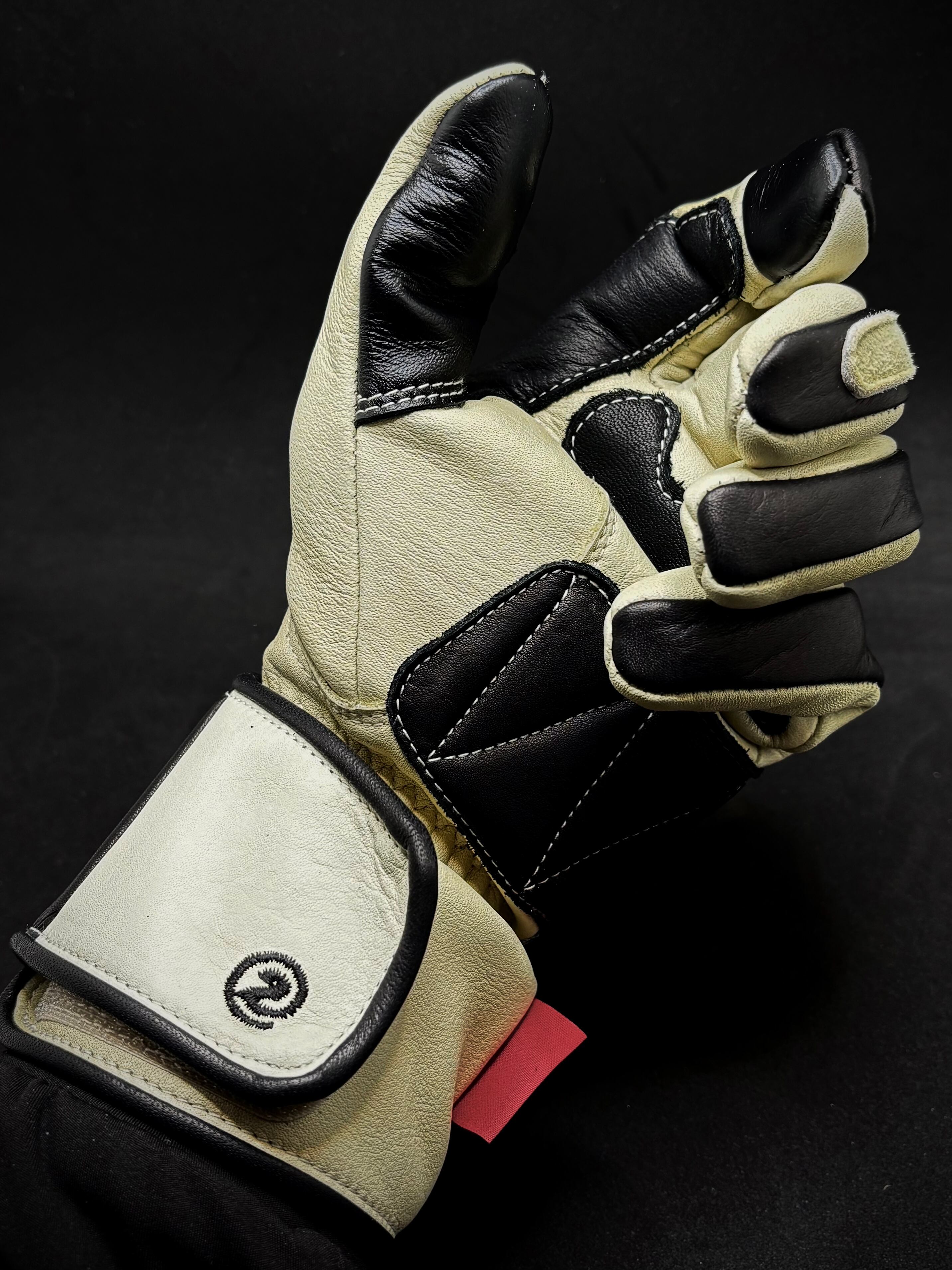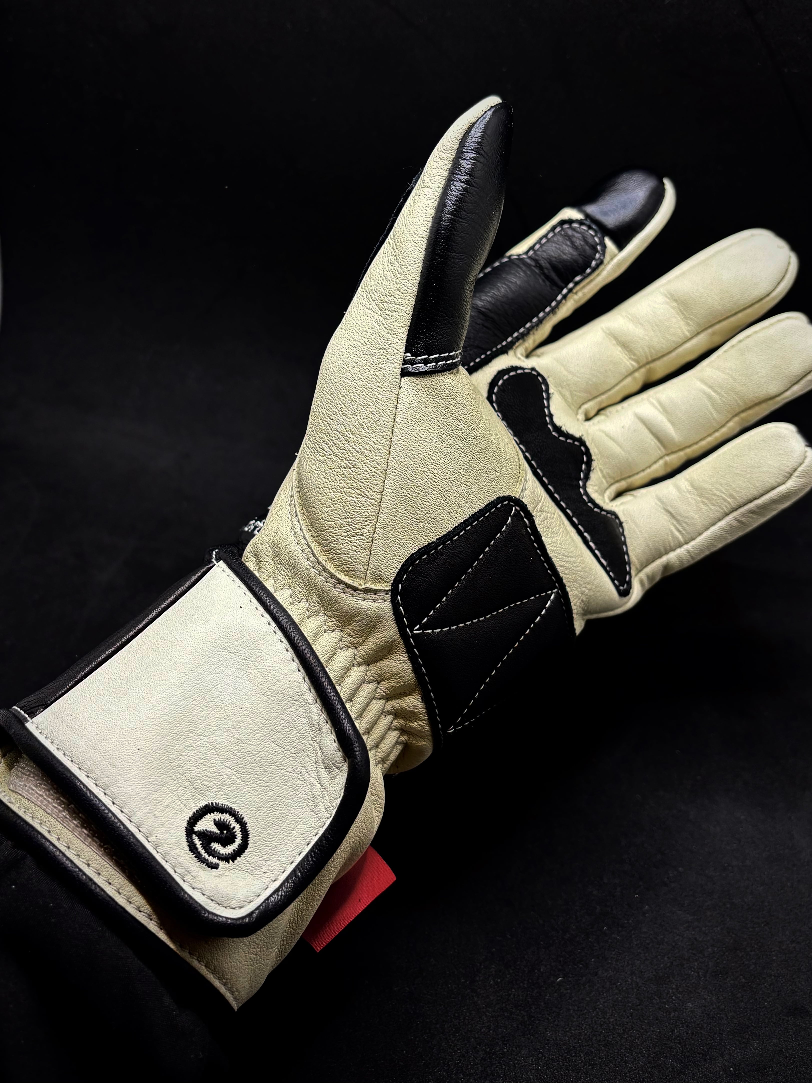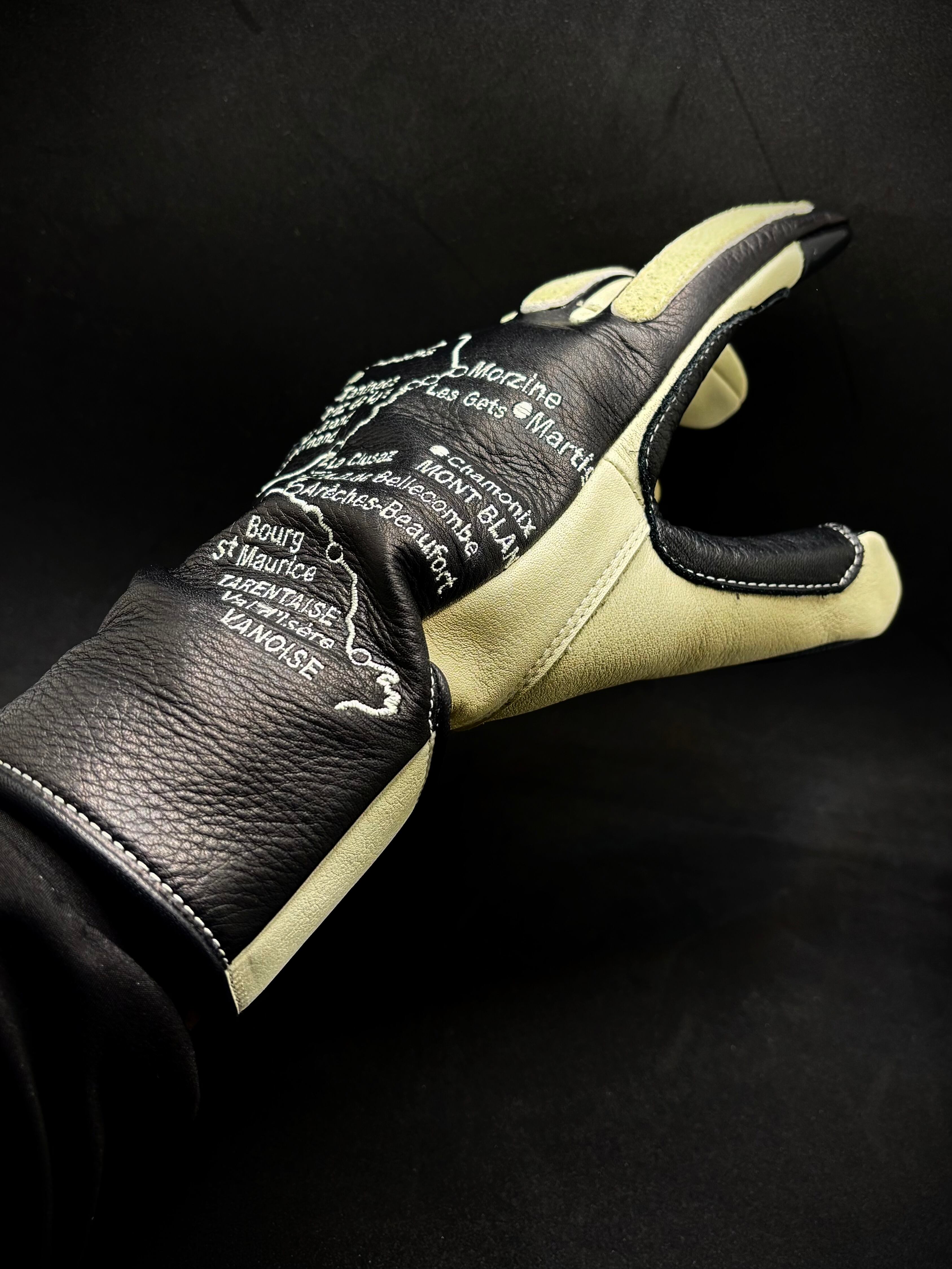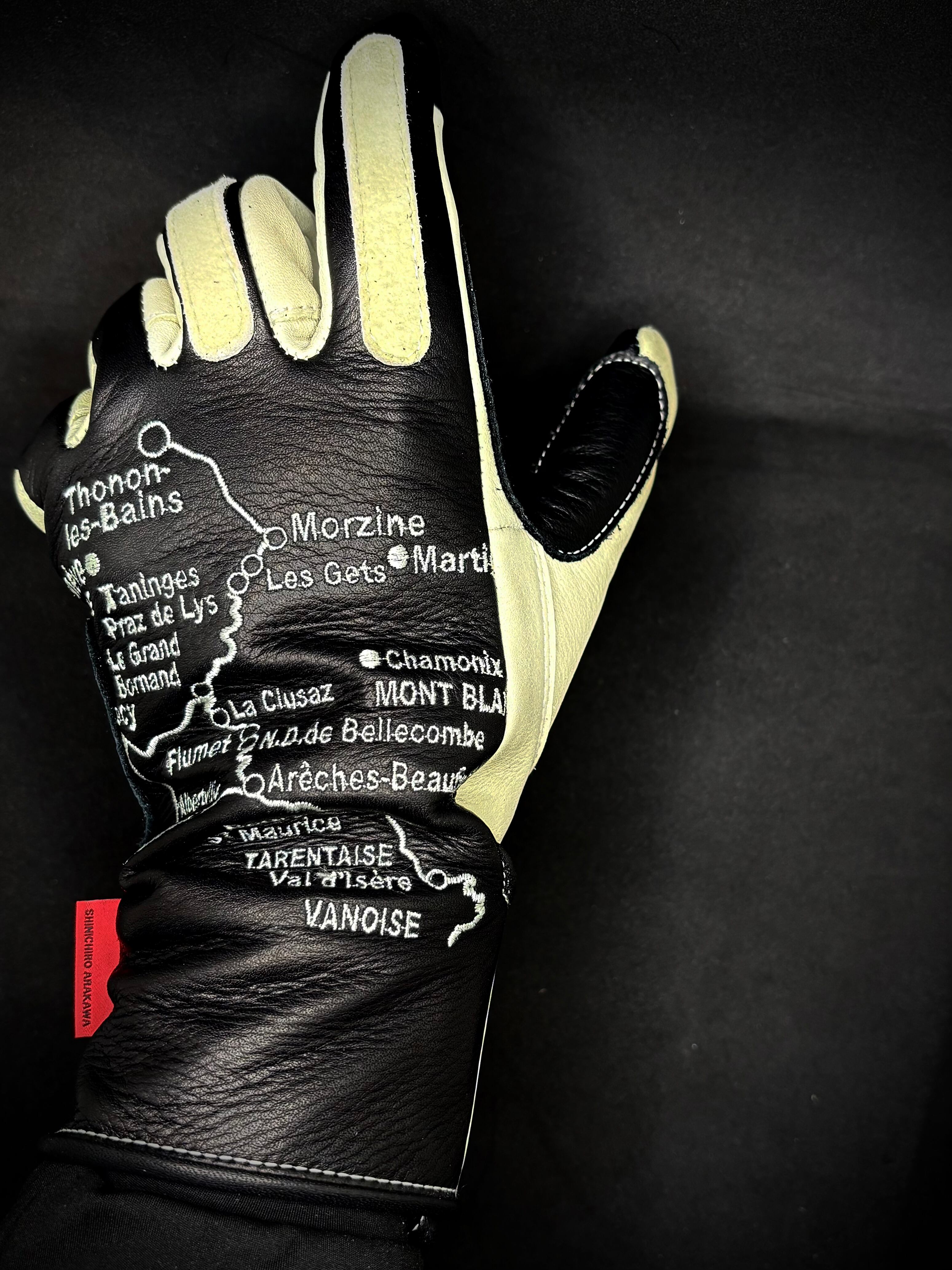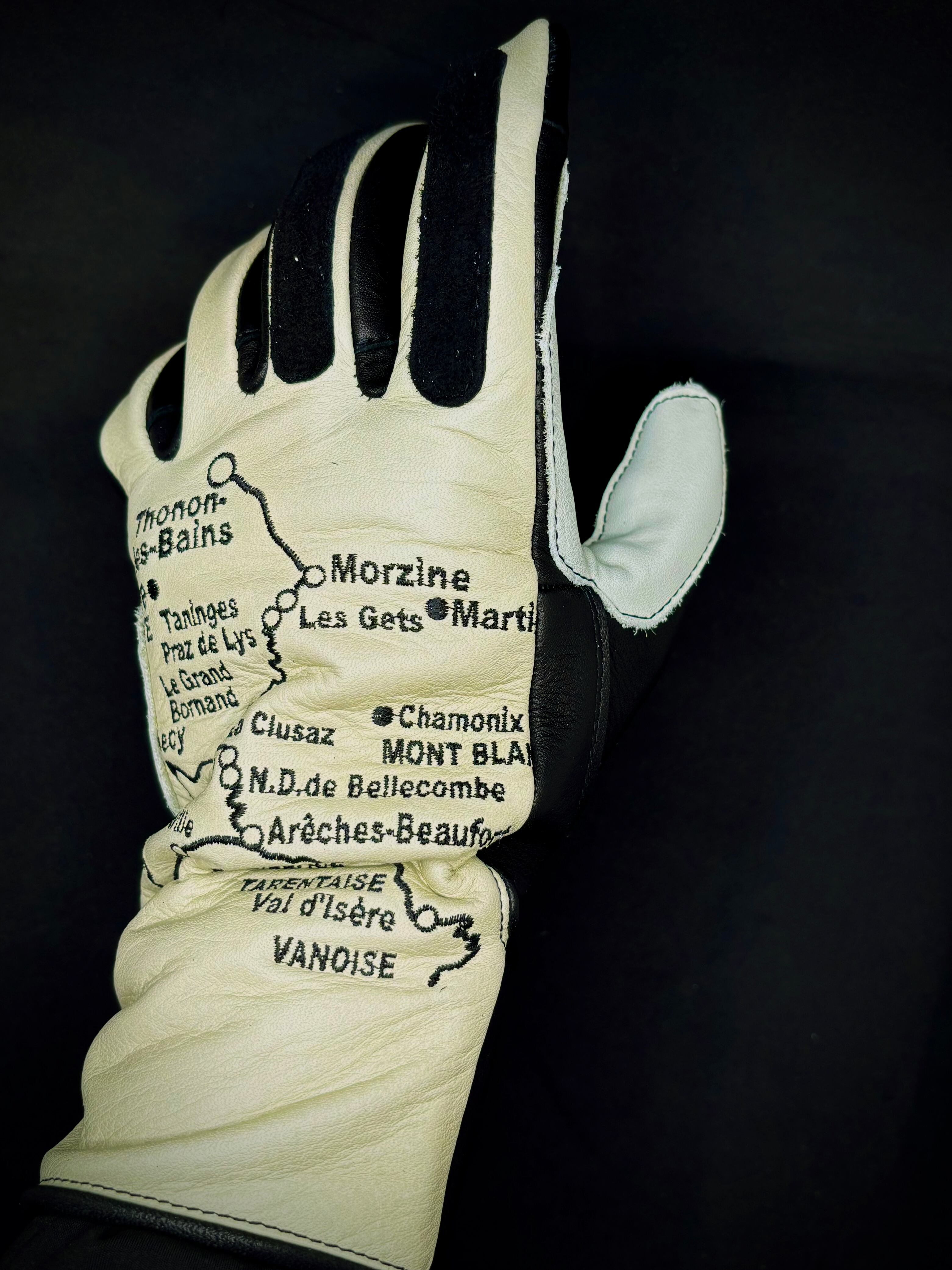 左右の手の甲にヨーロッパの美しいアルプス山脈の街道の地図を刺繍を施したヴィンテージレーシングタイプグローブ。